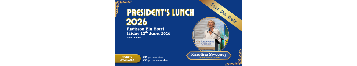 Join us on Friday, 12th June at 12pm for the Letterkenny Chamber President’s Lunch at the Radisson Blu Hotel, a celebration of the Chamber and a standout event on our business calendar.